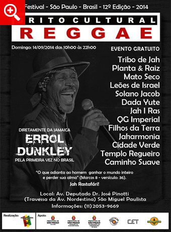 Nesta 12º Edição, o Grito Cultural Reggae traz pela primeira vez para o Brasil uma das maiores lendas do reggae mundial, ERROL DUNKLEY, um dos primeiros artistas de reggae na década de 60 e na cena inglesa dos anos 70.