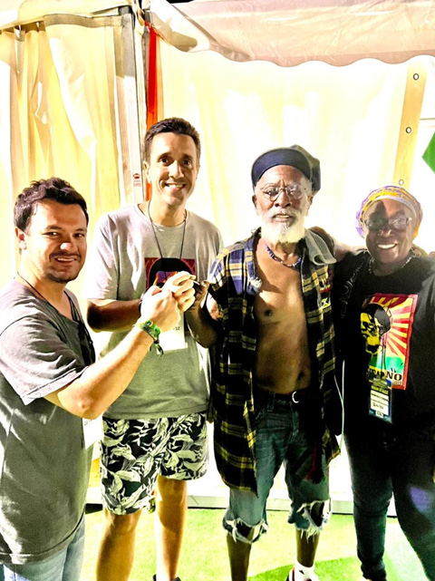 (Henrique e Rafael da Riddim Agency/Surforeggae e Burning Spear, ao lado de sua esposa Sonia Rodney)